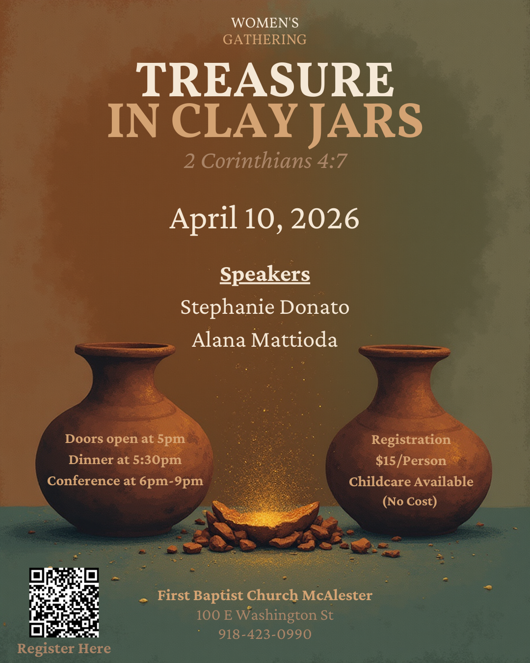 Women's Gathering 2026 Friday, April 10, 2026 5:00 PM 9:00 PM 17:00 21:00 First Baptist McAlester 100 East Washington Avenue McAlester, OK, 74501 United States (map) Google Calendar ICS Register Here